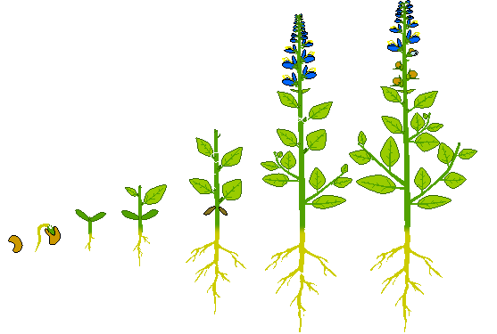 Una planta verdadera está compuesta básicamente por un tallo, una raíz, unas hojas y unas estructuras reproductivas que llamamos flores o frutos, en función del momento del ciclo en el que se encuentran. En la figura siguiente encontrarás algunas de esas partes a lo largo de parte del ciclo de vida de una planta. Para ampliar esta información te proponemos los siguientes temas que encontrarás en la lista de la izquierda.